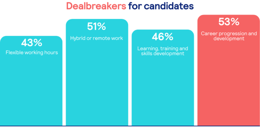 Our research found that 53% of workers wouldn’t apply for a role without career progression on offer, while 51% say the same for hybrid/remote working.