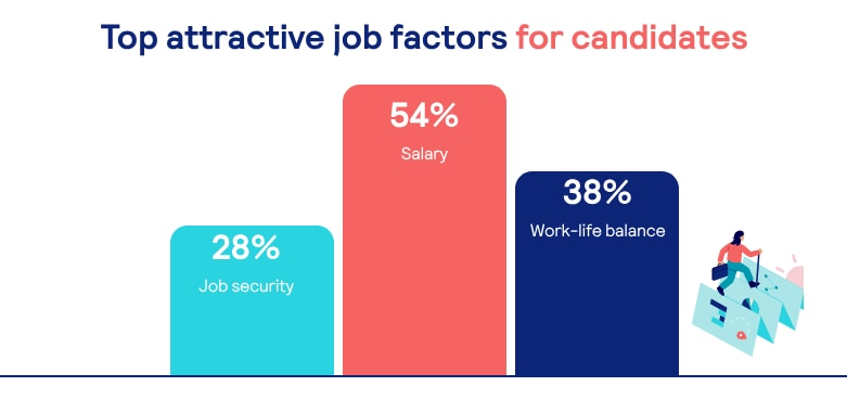 Candidates are mainly motivated by salary, work-life balance and job security. Flexibility is essential, with 72% of workers willing to leave a job that doesn’t support flexible working.