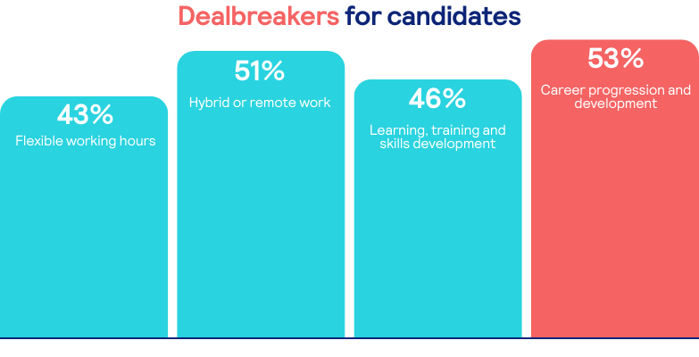 - Career development is a priority for candidates, with many unwilling to apply for roles lacking progression, learning opportunities or hybrid/remote options