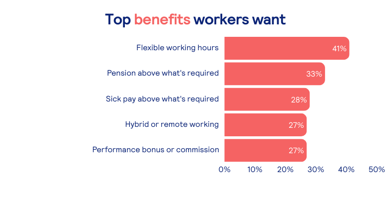 It’s difficult to overstate how much of an incentive flexible working can be for today’s candidates. In fact, our latest research shows that flexible working hours are the most desired benefit among UK workers (41%).